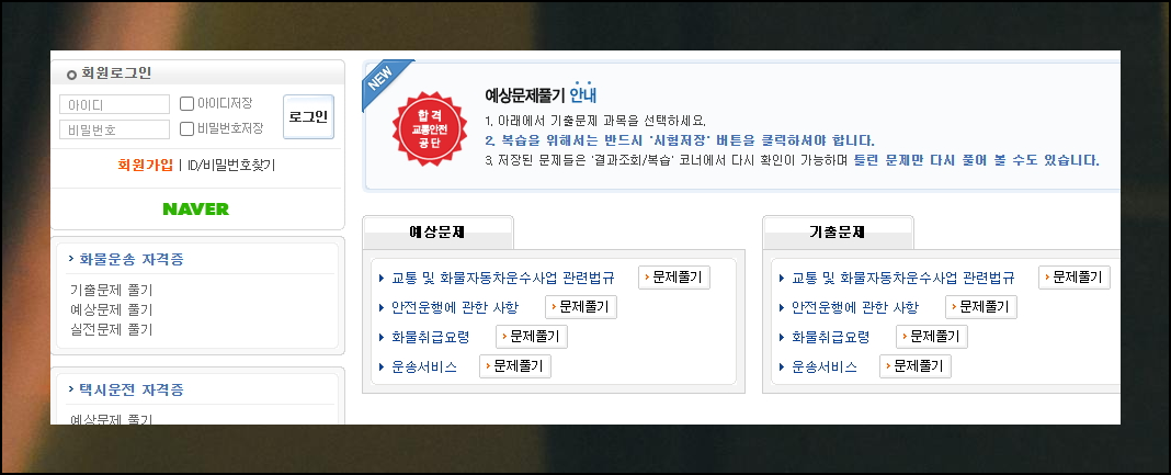 왼쪽 메뉴에서 원하는 과목을 고르실 수 있습니다. 화물취급요령을 제외한 나머지 과목들이 버스운전 자격시험의 과목과 동일해요. 그렇기 때문에 해당 과목에 대한 기출문제를 이곳에서 풀면 됩니다.