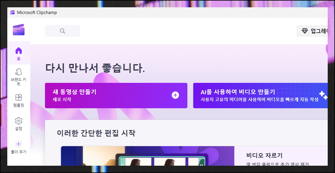 프로그램을 실행하면 새 작업을 시작할 수 있는 화면이 나타납니다. 일반 제작은 Create a new video를, AI 도움이 필요하다면 Create a video with AI를 선택하세요. 화면 아래쪽에는 SNS나 게임 등 용도별 템플릿이 있어서 동영상 제작이 더욱 쉬워져요.