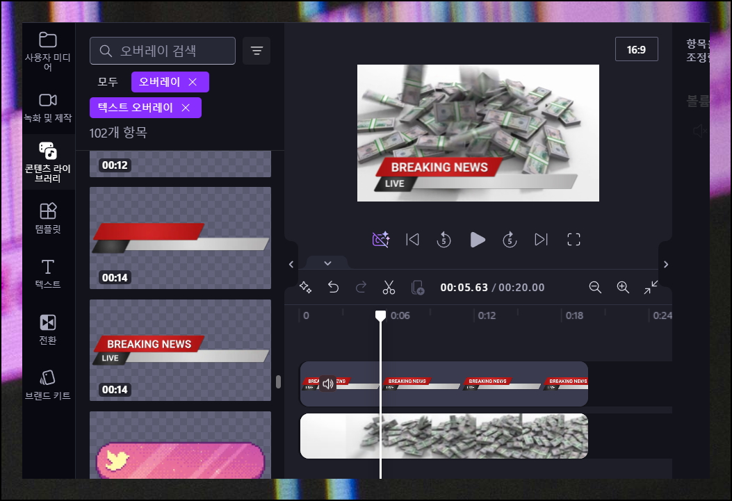 시청자의 이해를 돕는 자막을 추가해 보겠습니다. 왼쪽의 Templates 메뉴에서 다양한 스타일을 선택할 수 있어요. Text overlays 섹션의 멋진 자막 디자인으로 프로그램 활용이 더욱 풍부해져요.