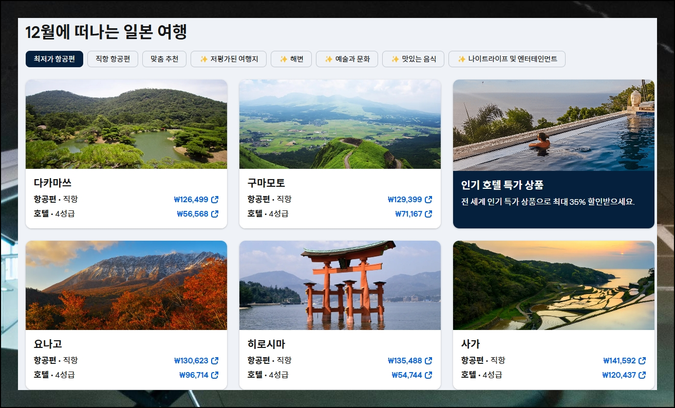 일본 전체를 검색하면 각 지역별 항공권 가격을 비교해볼 수 있어요. 특히 여행지를 고민 중이신 분들께 매우 유용한 기능입니다. 각 도시별 비행기표의 특징도 확인할 수 있죠.