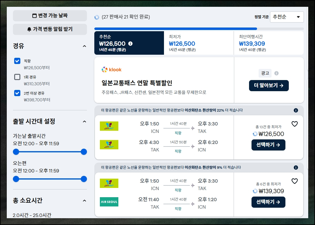 항공편 선택 시 예약 가능한 항공사들의 정보가 나타나요. 일본행 항공권 가격은 수시로 변동될 수 있으니 알림 서비스를 설정하는 것이 좋습니다. 현재 비행기표 요금이 적당하다고 생각되면 바로 예약을 진행하실 수 있어요.