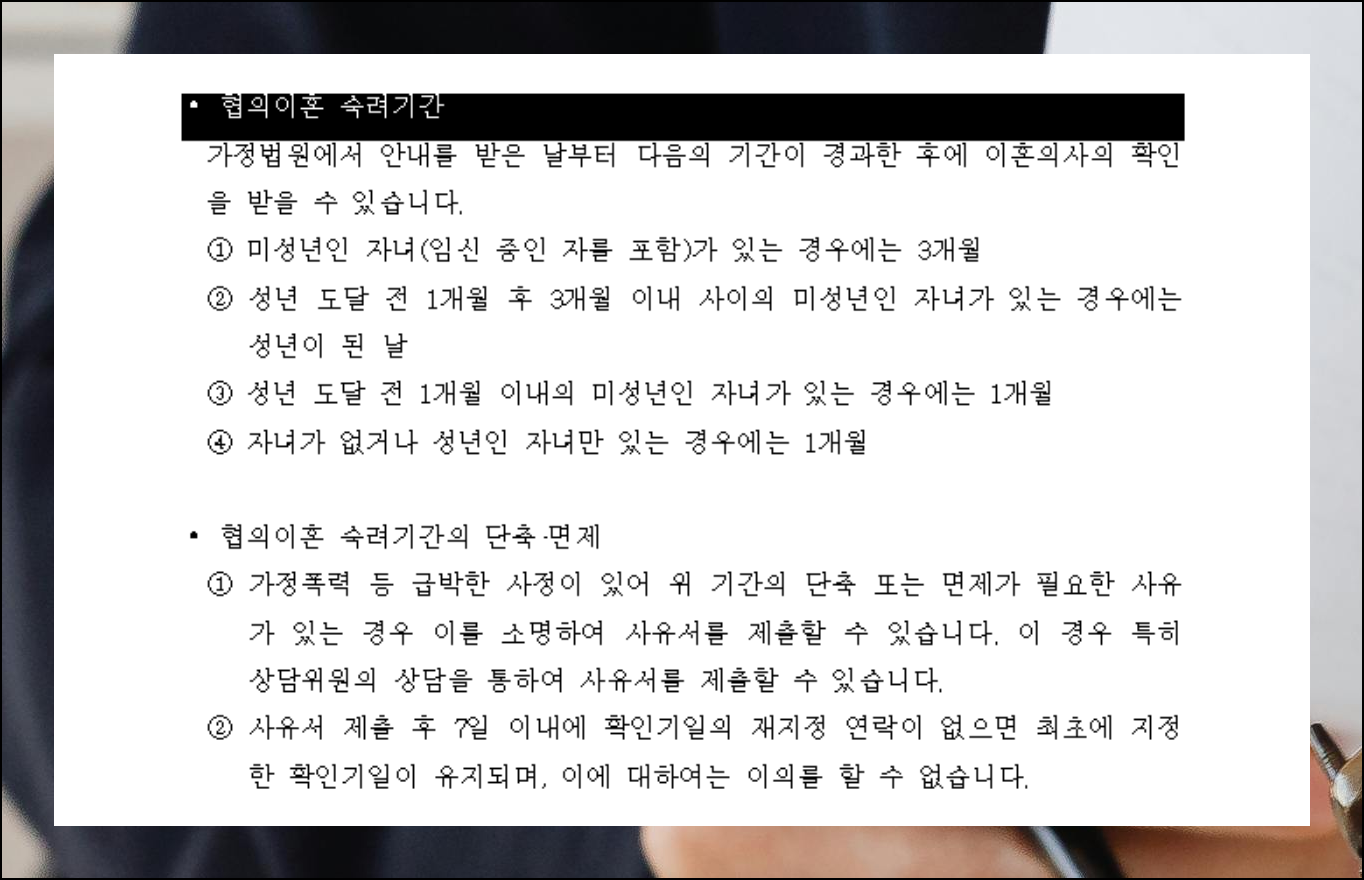 법원에 관련 서류를 제출하고 나면 숙려기간이 주어져요. 보통 1개월이나 3개월 정도입니다. 이 기간 동안 특별히 해야 할 일은 없지만, 절차상 중요한 시간이에요. 하지만 마음의 준비를 하고 결정을 다시 한번 생각해보는 소중한 시간이 될 수 있습니다. 급한 사정이 있다면 숙려기간을 줄이거나 면제받는 방법도 있어요. 상담위원과 상담 후 사유서를 제출하면 되니까 걱정하지 마세요.