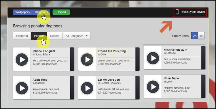 화면 왼쪽 위에서 링톤을 눌러보세요. 다양한 벨소리가 여러분을 기다리고 있어요. Popular 메뉴는 많은 분들이 찾는 다운받는곳 인데요. 시작하기 전에 우측 상단에서 내 휴대폰 모델을 먼저 선택해주세요.