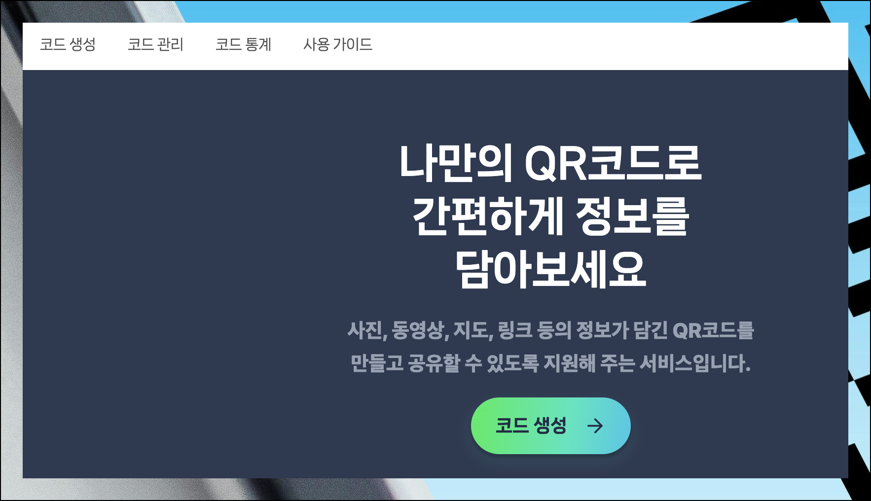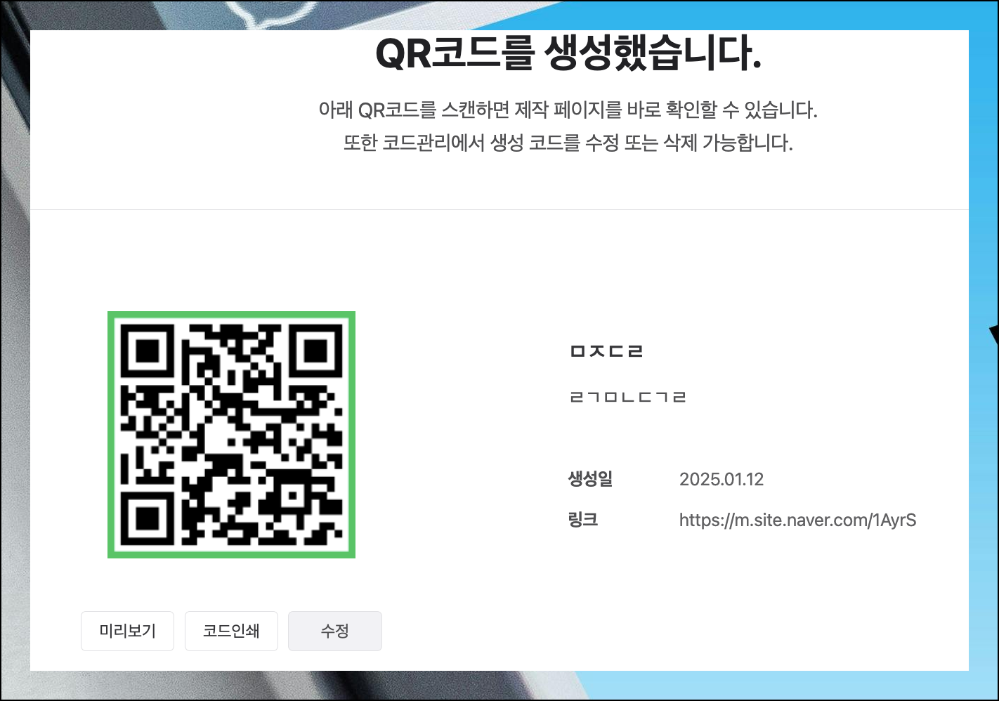 qr코드 만들기 버튼이 메인 화면에 있어요. 제작한 코드는 관리 메뉴를 통해 언제든지 확인할 수 있습니다. 무료로 제공되는 관리 기능을 통해 수정도 가능해요.