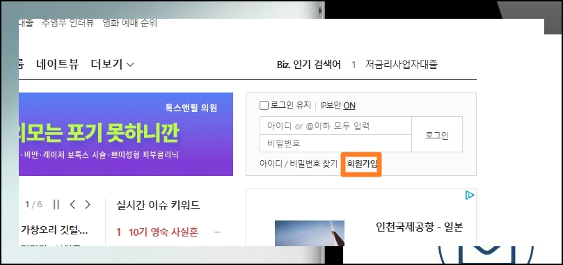 처음 방문하시면 화면 오른쪽에서 로그인 섹션을 발견하실 수 있어요. 이메일 주소를 만들기 위한 첫 단계로 회원가입 버튼을 찾아 클릭해주세요.