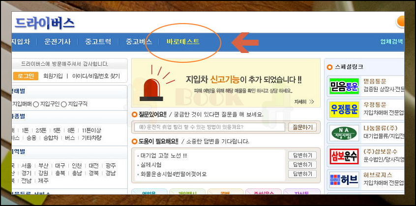 사이트 상단 메뉴에서 바로테스트를 쉽게 찾을 수 있어요. 중고트럭이나 운전기사 메뉴 옆에 위치해 있으니 클릭해주세요. 화물운송 자격시험 기출문제를 실전처럼 풀어볼 수 있는 공간이 준비되어 있습니다. 문제 풀이 후 바로 해설도 확인할 수 있죠.